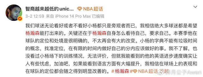 媒体人王健也更新社媒,谈到了杨瀚森的语言关,他表示:小杨的字典不能有垃圾时间的概念,找准定位,在有限的时间内做好自己的分内应该做好的事。我不了解,也没看过小杨场下的训练情况,无法评价,但就我能看到的他的英语进步速度确实让人有些忧虑,加油吧,如果能看到语言方面有大幅提升,我相信在球场上的表现和在球队的定位都会随之得到明显改善的。